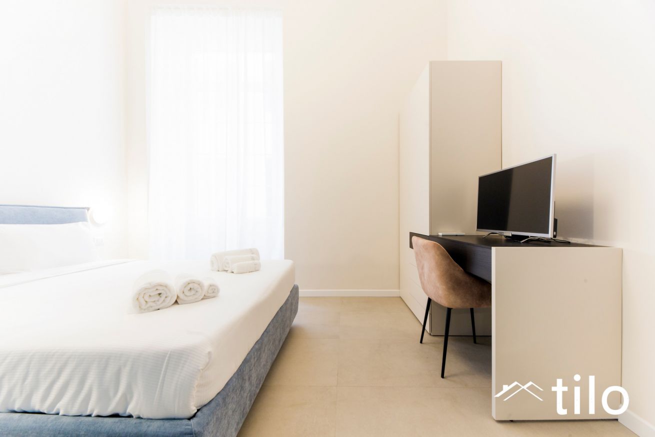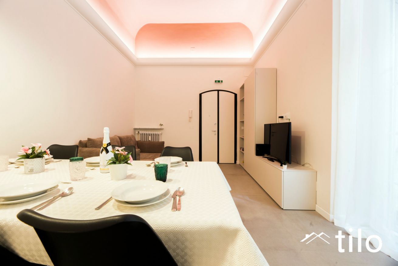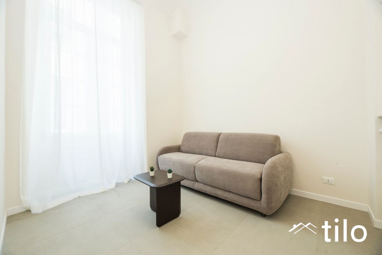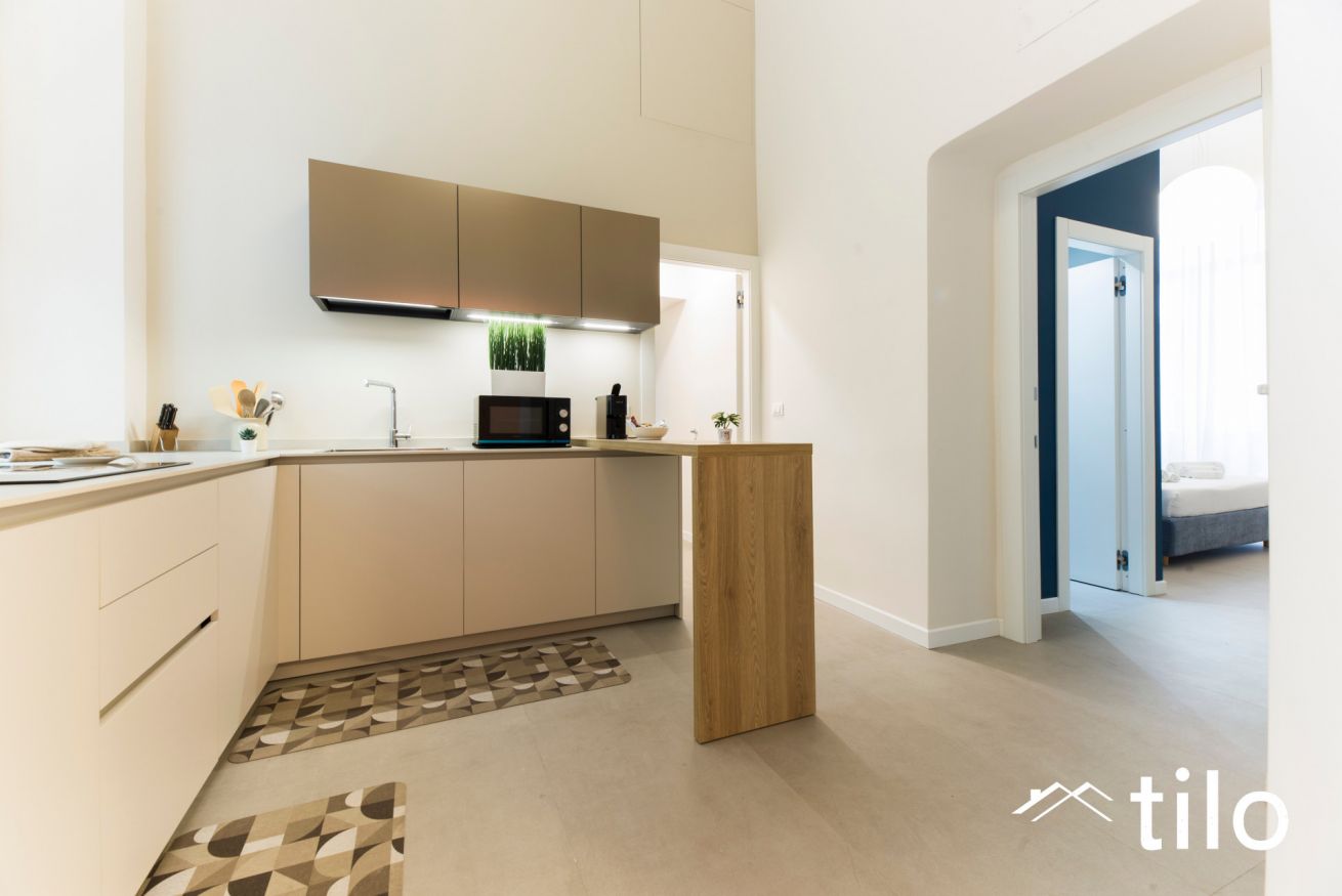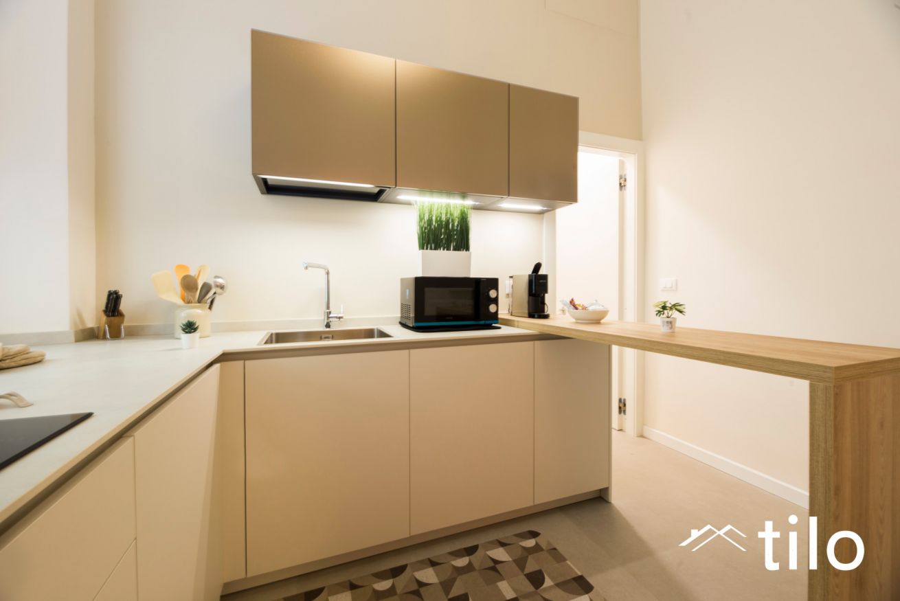 La zona giorno è il cuore della casa: un ampio open space che unisce soggiorno e cucina, perfetto per momenti di relax, lavoro o convivialità. Il soggiorno offre uno spazio accogliente dove rilassarsi dopo una giornata in città, mentre la cucina, completamente attrezzata, permette di preparare pasti in totale autonomia grazie a elettrodomestici moderni e utensili completi.