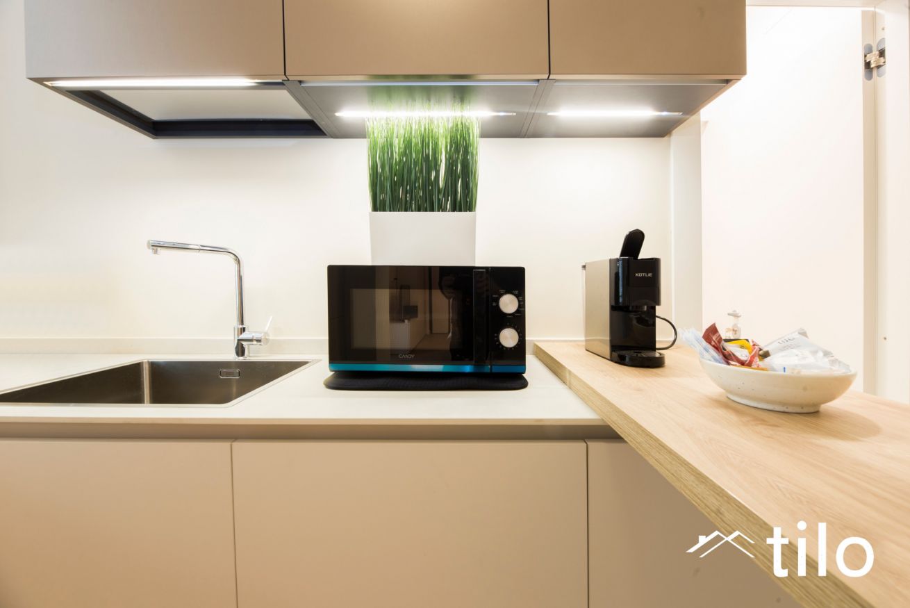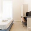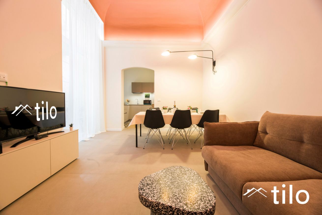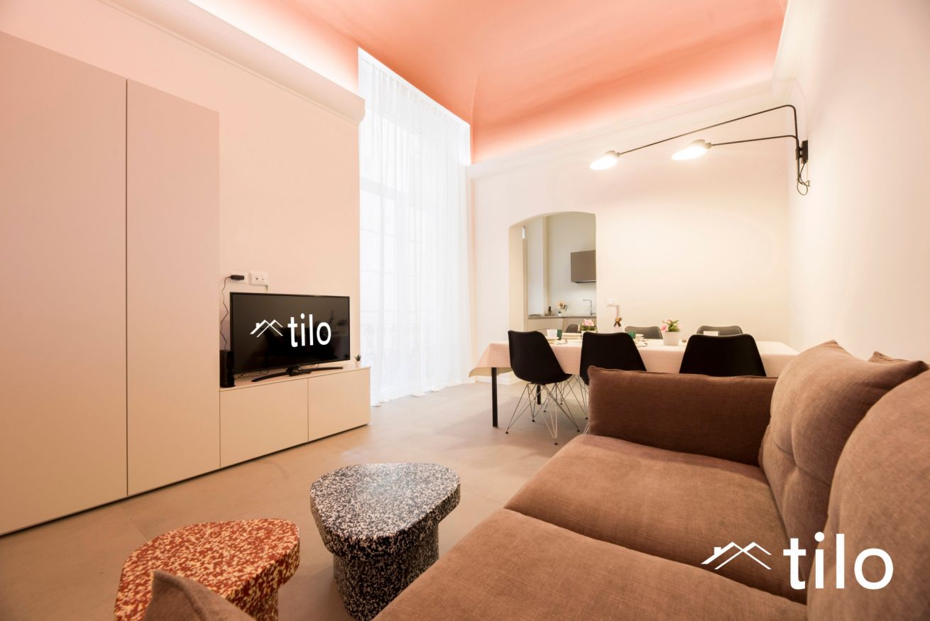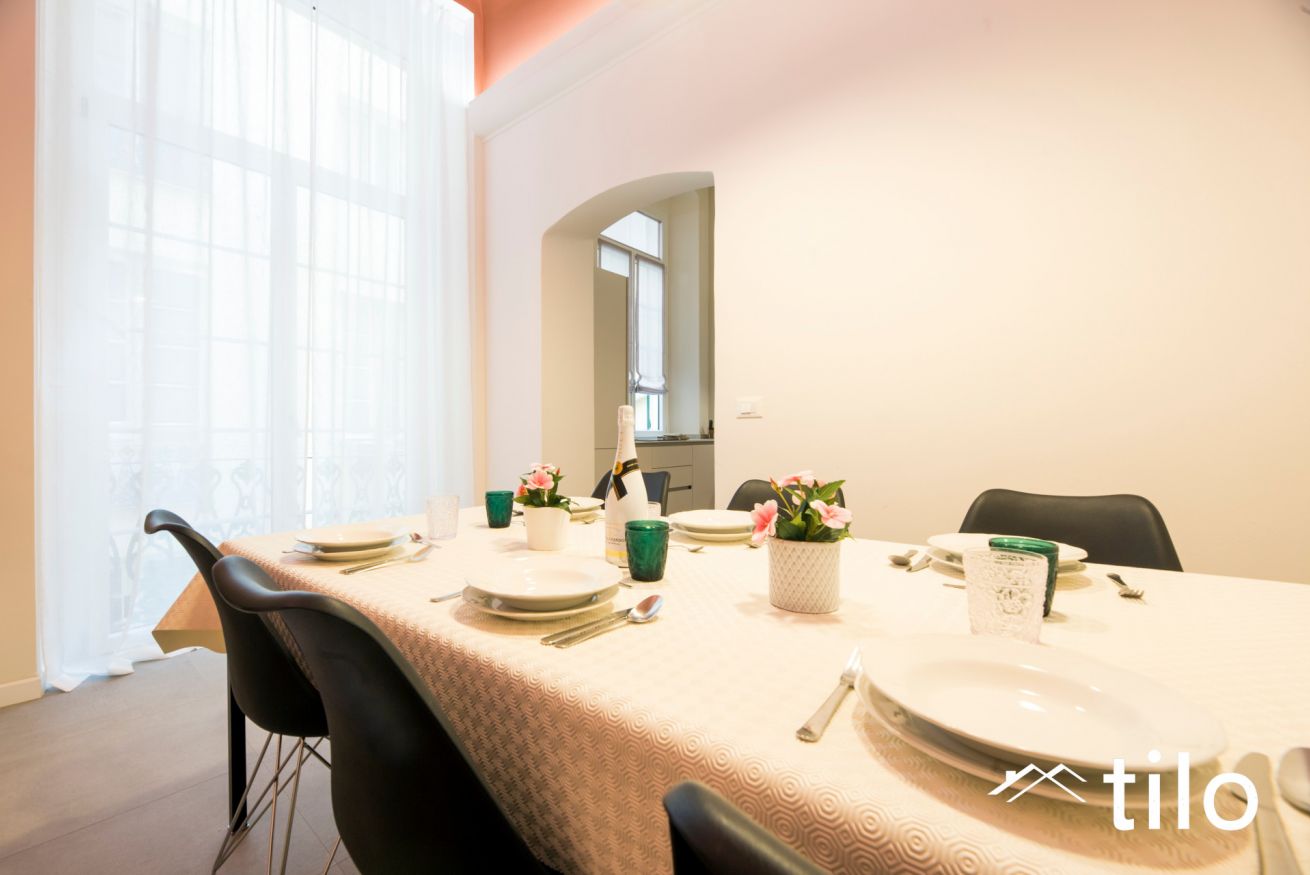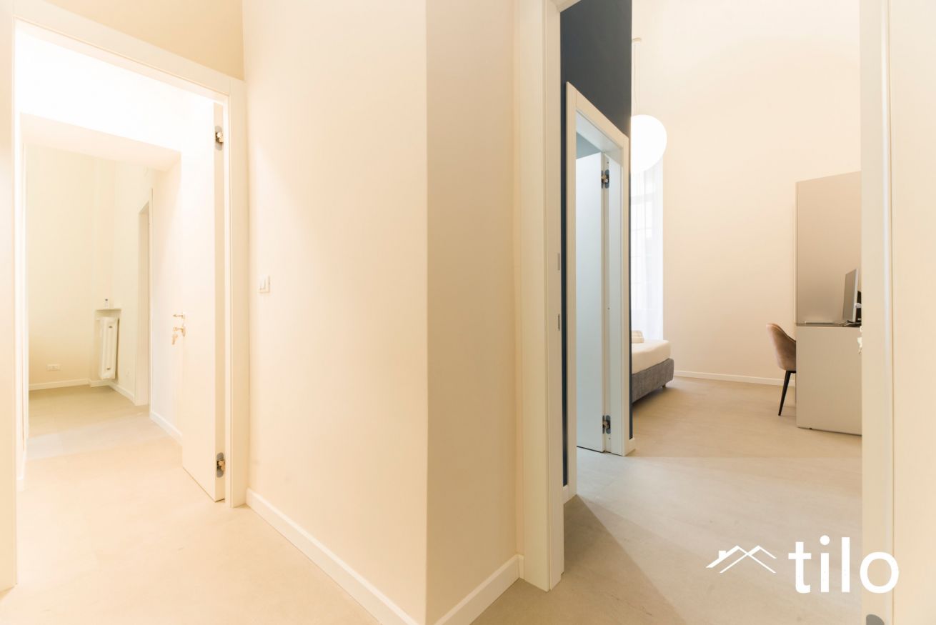 La zona giorno è il cuore della casa: un ampio open space che unisce soggiorno e cucina, perfetto per momenti di relax, lavoro o convivialità. Il soggiorno offre uno spazio accogliente dove rilassarsi dopo una giornata in città, mentre la cucina, completamente attrezzata, permette di preparare pasti in totale autonomia grazie a elettrodomestici moderni e utensili completi.