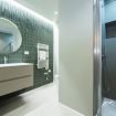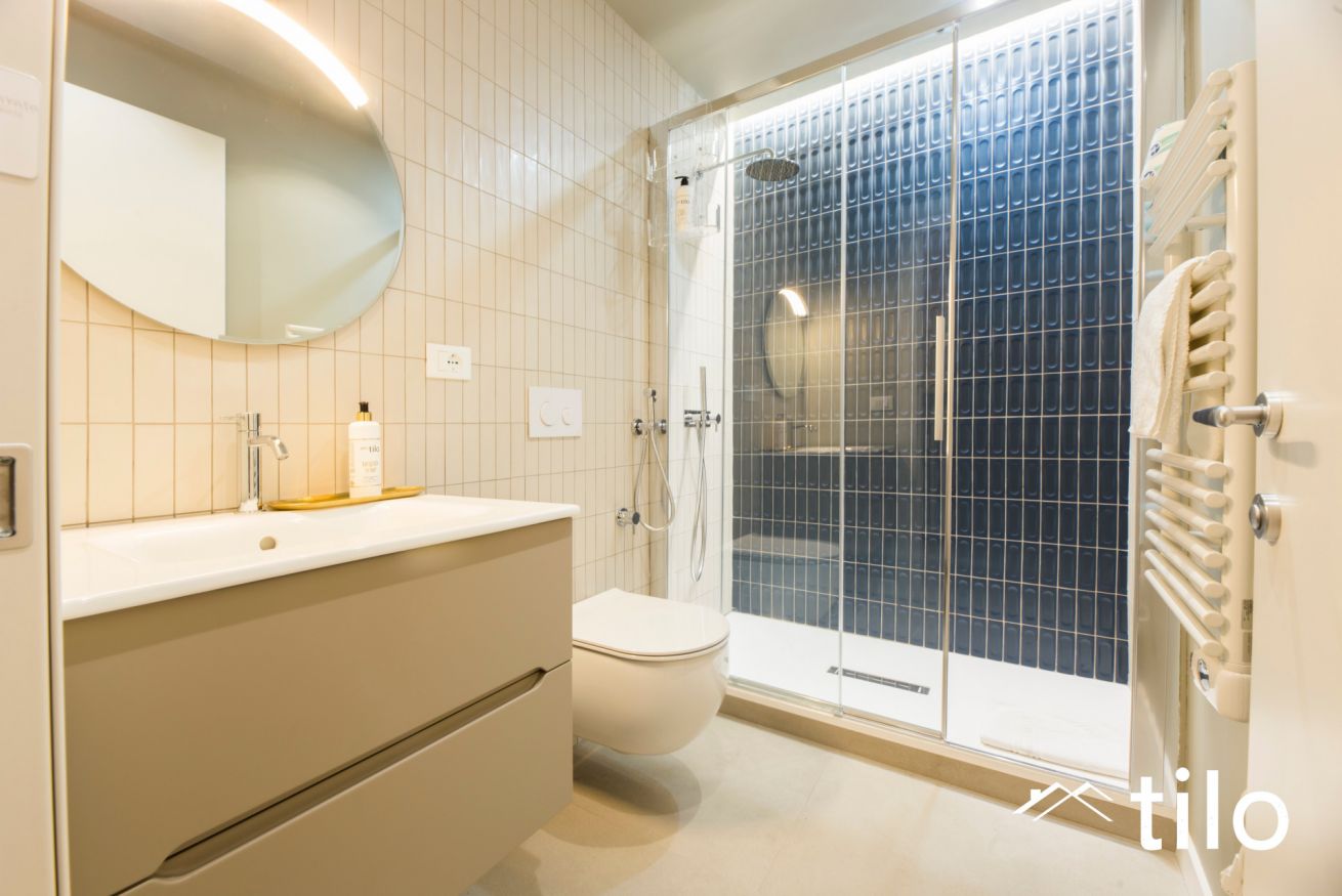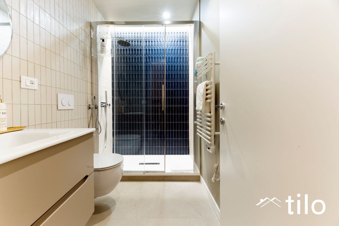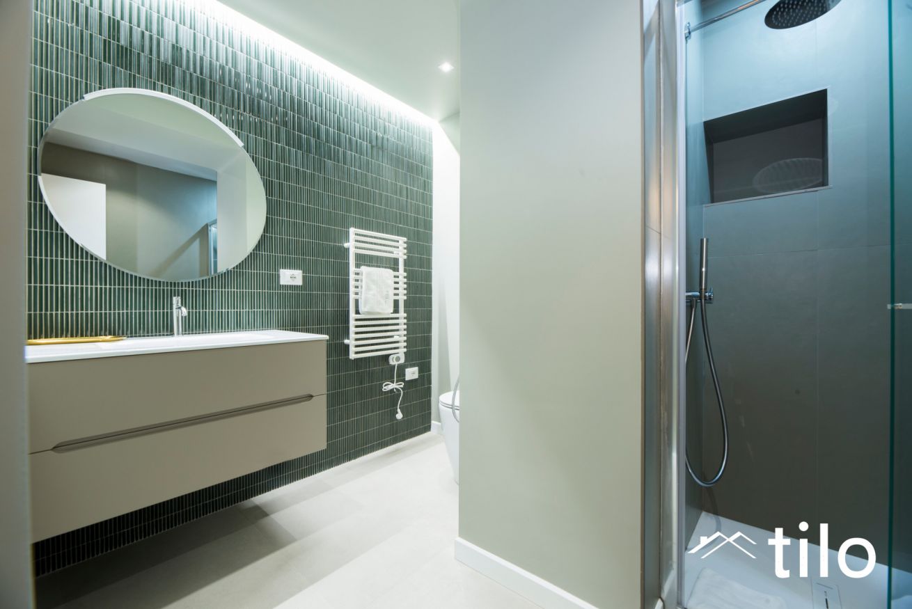 I due bagni, entrambi privati e rifiniti con materiali contemporanei, sono progettati per garantire funzionalità e comfort anche quando l’appartamento è occupato da più persone.
