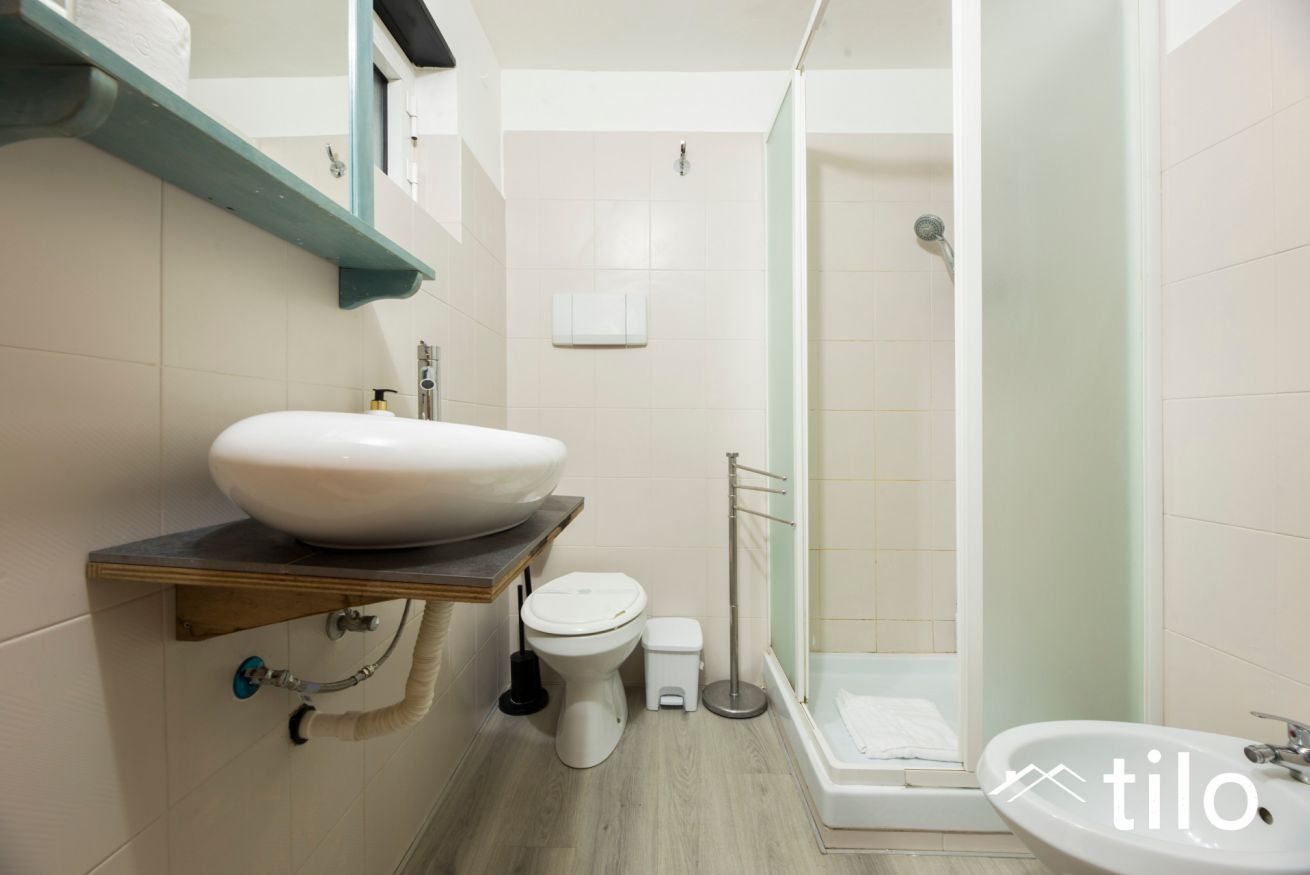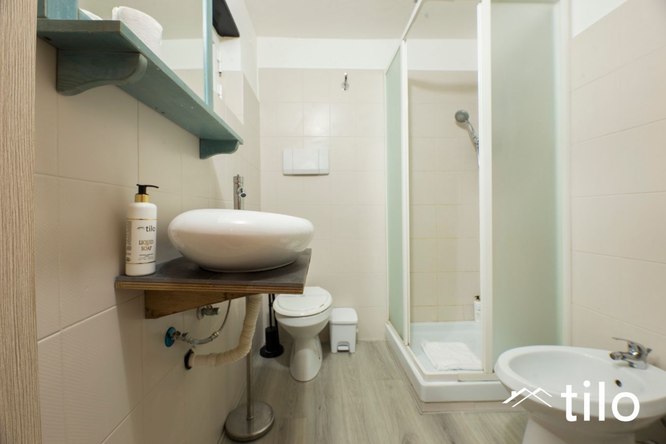 Completa l’appartamento un bagno privato con doccia, dotato di biancheria e asciugamani.