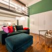 Zona living accogliente e raffinata: un ampio soggiorno con divano letto di design, illuminato da grandi finestre che donano luce naturale e un’atmosfera rilassante. L’arredamento moderno e curato nei minimi dettagli rende lo spazio elegante e funzionale.