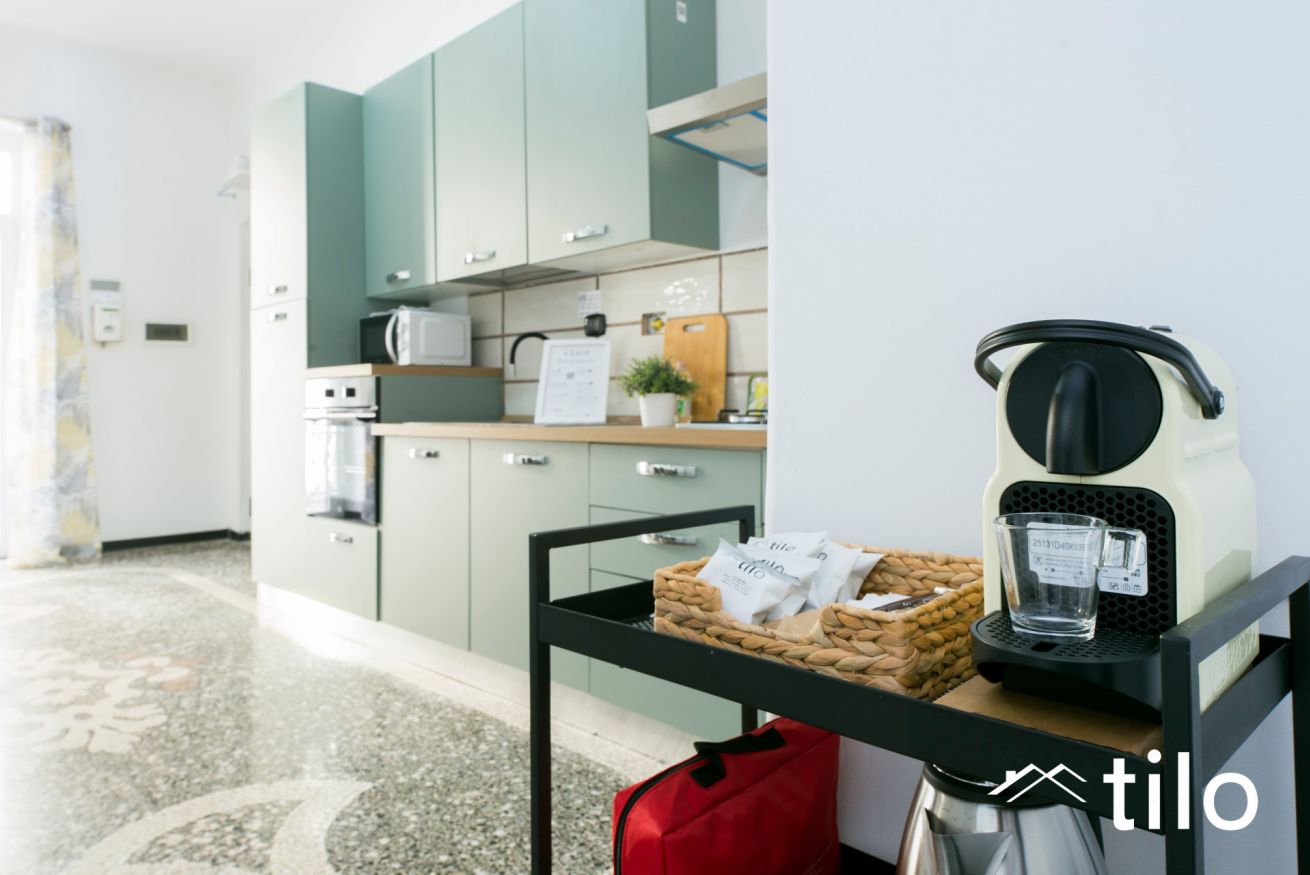 Cucina moderna completamente attrezzata con forno, microonde, macchina del caffè, bollitore, stoviglie e lavatrice.