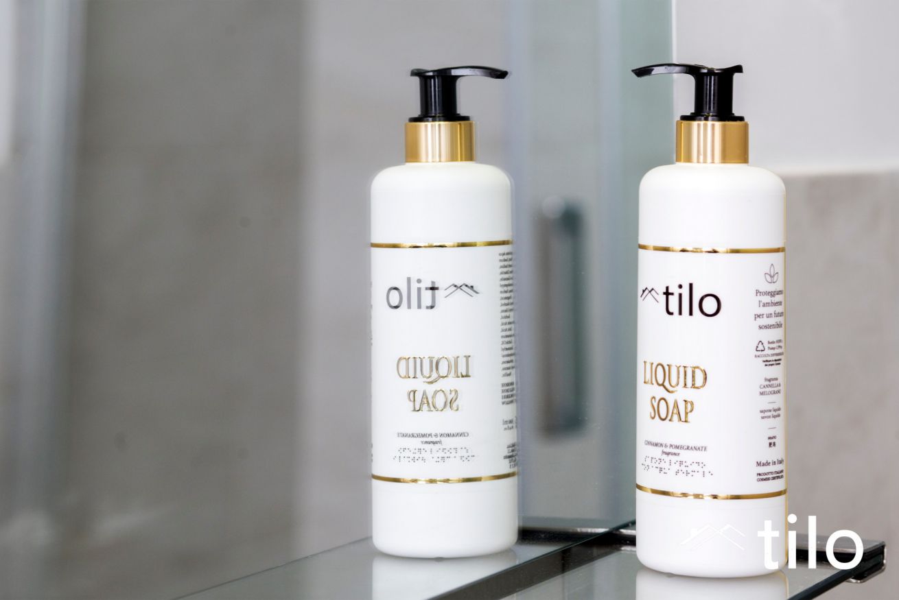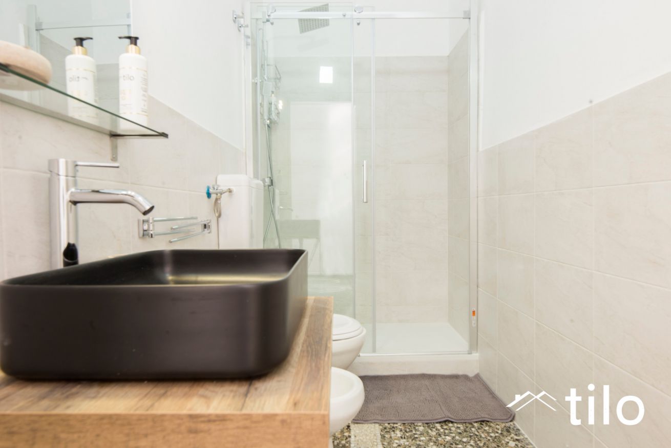 Due bagni moderni e funzionali con doccia spaziosa, set di asciugamani, asciugacapelli e prodotti bagno Tilo.