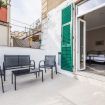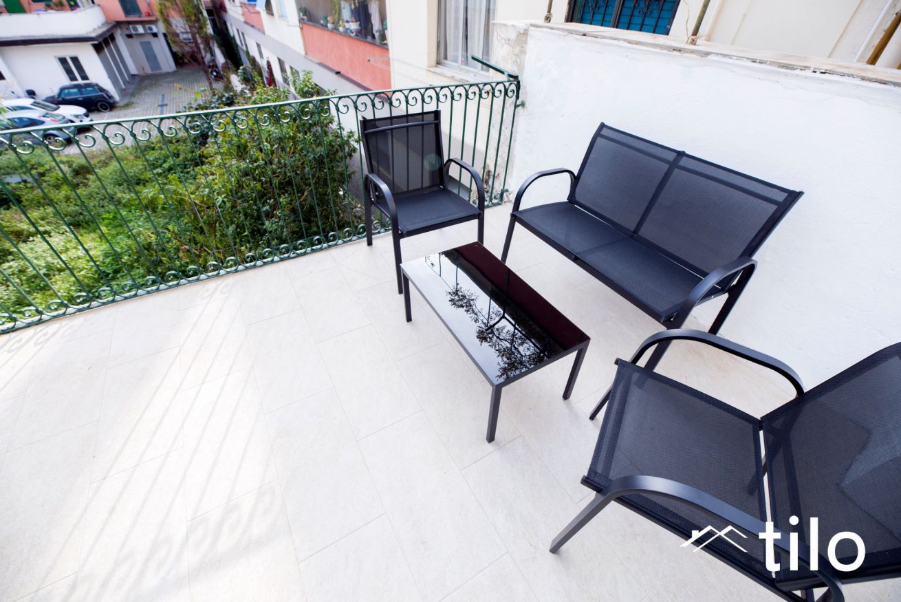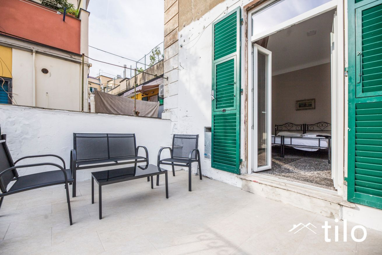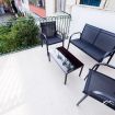 Terrazzo privato con sedute e tavolino, perfetto per rilassarsi o consumare un pasto all’aperto.